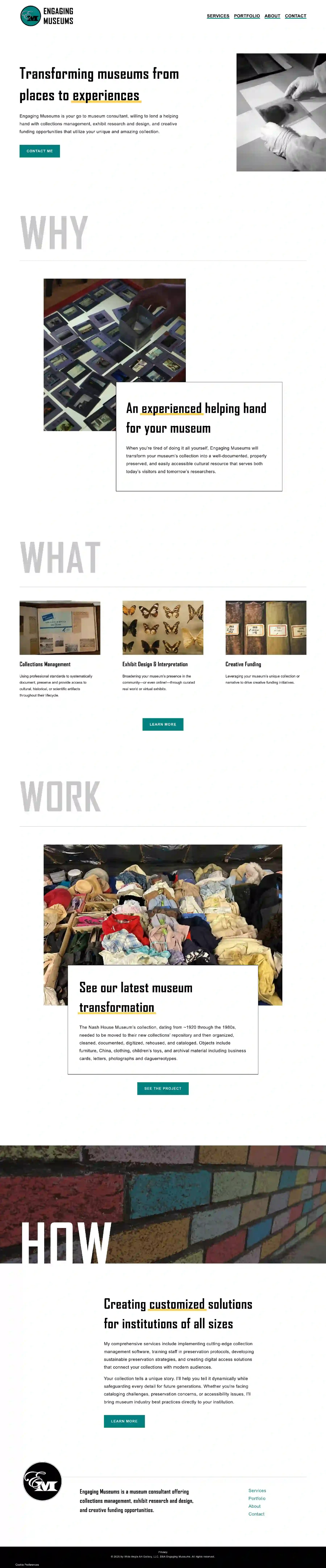 Noelle’s site includes an extensive portfolio detailing her work with museums throughout Western New York. Each portfolio page includes information about her work, links to media coverage and videos, and a project gallery sharing a behind-the-scenes look at how her work comes together.