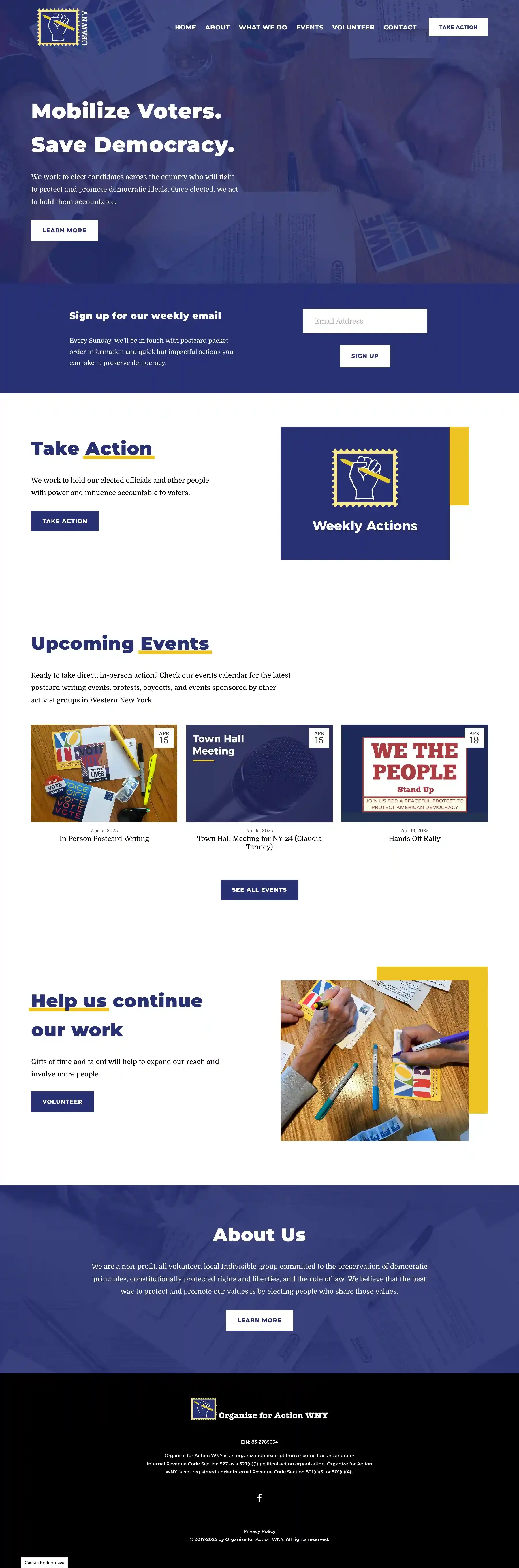 Because the group is part of the Indivisible network, I brought Indivisible’s font palette and bold style to the Organize for Action website. I kept the design simple and let the colorful photos speak for themselves. I used bright colors to highlight the newsletter signup areas—the site’s main call-to-action—and added some subtle animations throughout to keep the design interesting without being overwhelming. I added some custom code to create fun button hover effects and a few other bells-and-whistles.