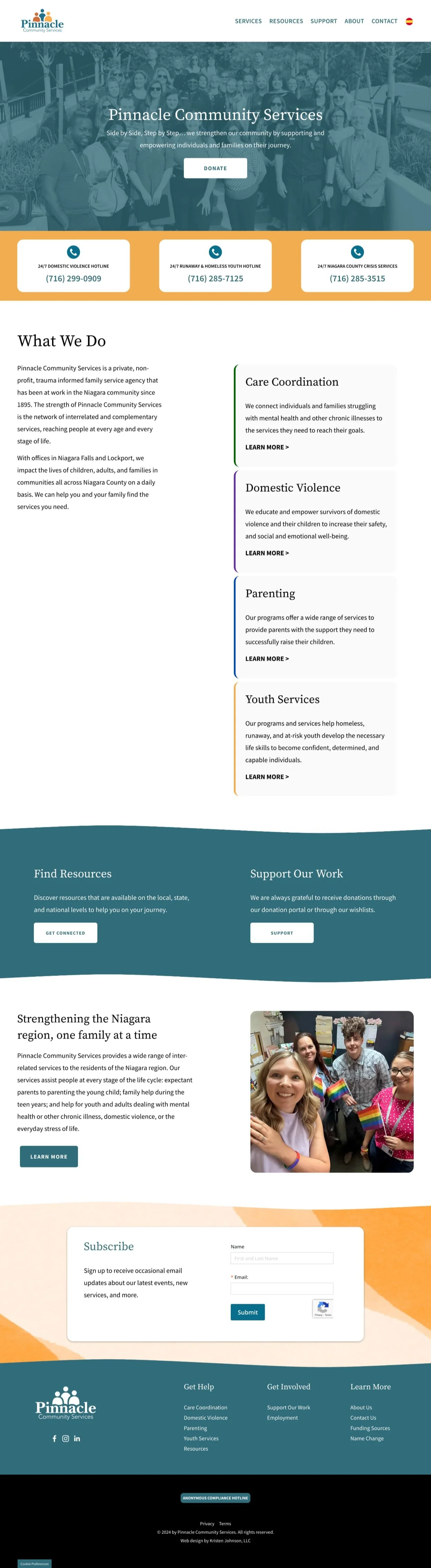 Pinnacle’s core services—domestic violence support, care coordination, parenting support, and youth services—weren’t well represented on the existing site. Each service pillar has its own branding, which wasn’t included on the original site. We also needed to consolidate information, more clearly describe available services, and make it easier for people in need to reach out.